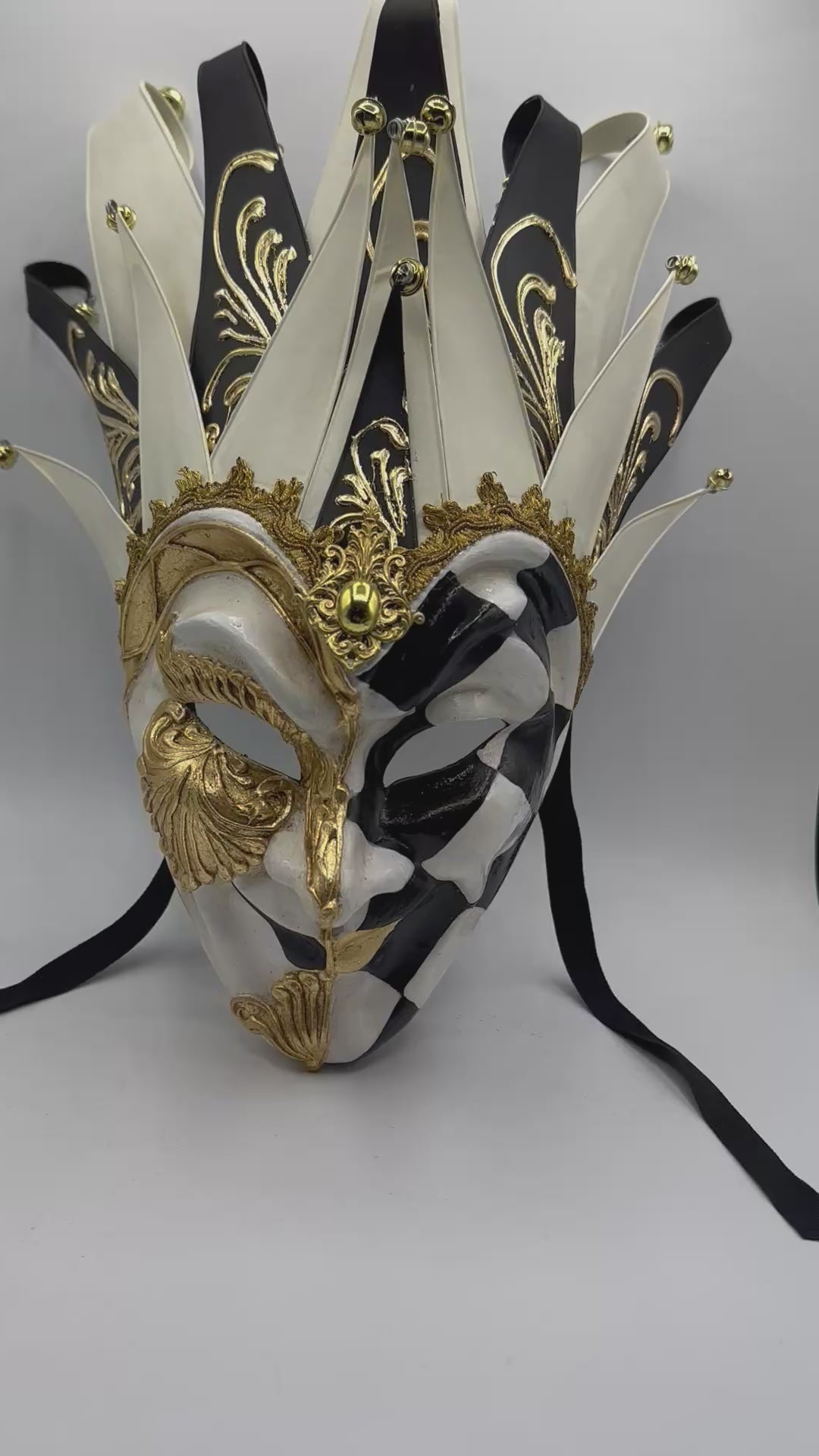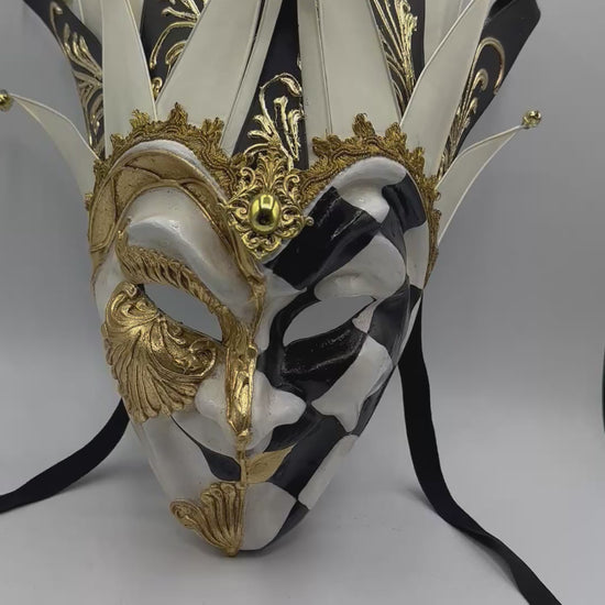 Luxury Venetian joker mask in black, white, and gold, featuring an ornate crown with decorative bells. A striking statement piece for masquerade balls, theater, or display.