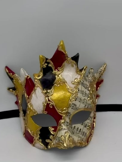 De rijke combinatie van goud, rood, zwart en wit, samen met het harlekijnpatroon en de muzieknoten, zorgt voor een krachtig en artistiek ontwerp. De verfijnde gouden details in reliëf geven het masker een luxe en hoogwaardige uitstraling.