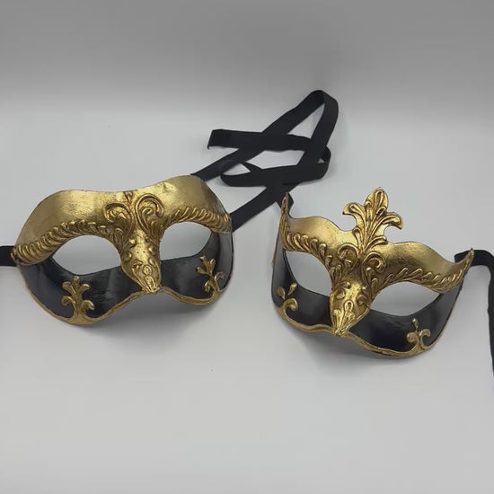 Cet élégant masque de couple vénitien en or et noir incarne la classe pure et le mystère.