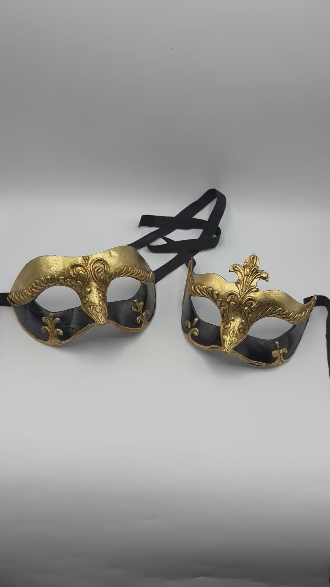 Ces deux masques sont fabriqués à la main en papier mâché et richement décorés de détails dorés de style baroque. Parfaits pour les couples qui souhaitent briller ensemble lors d'un bal masqué, d'un gala ou d'un événement à thème.